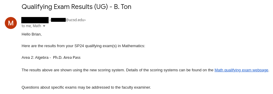 At the end of the year, perhaps against my better judgement, I decided to take the Algebra qualifying exam, which I luckily got a Ph.D. Area Pass on!